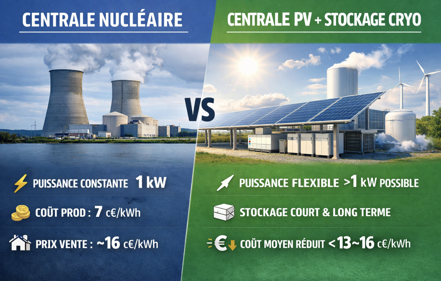 Coût projeté : ~1 000 €/kW hors cuves cryogéniques (5 cuves de 240 m² à ~90 000 € chacune)